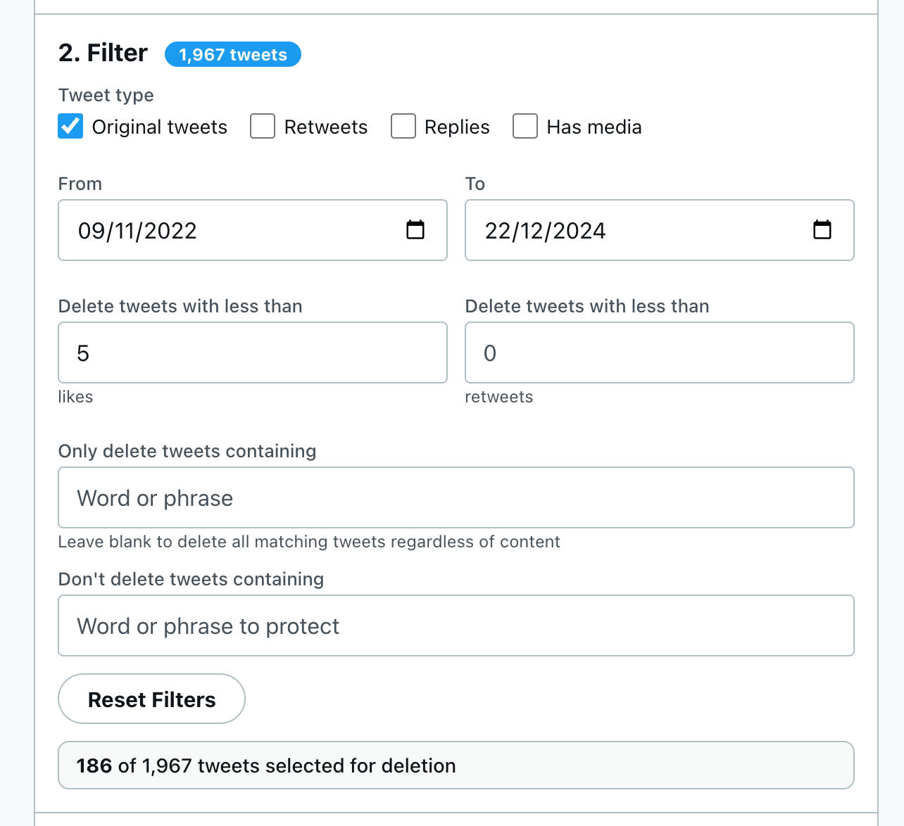 Target specific date ranges — delete everything before 2020, or only tweets from a particular year. Include or exclude keywords. Preview the results first.