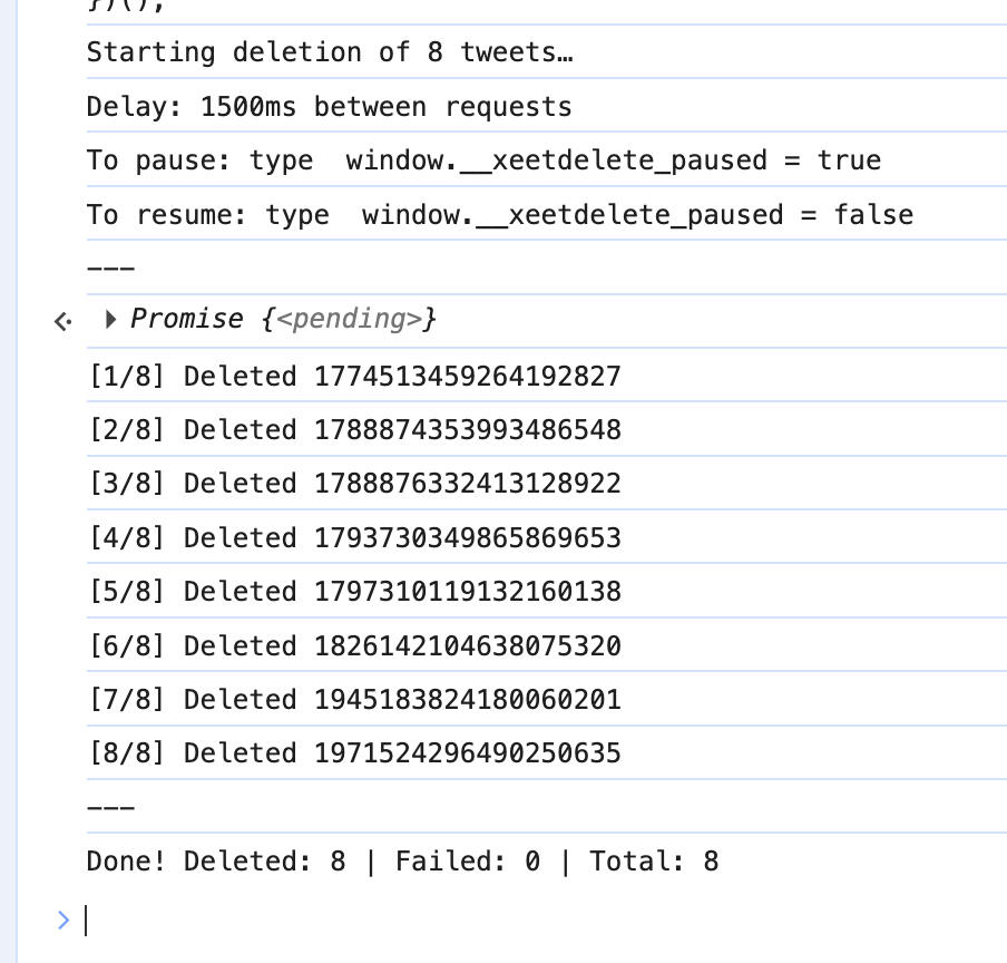 No server, no third-party access, no data leaving your machine. XeetDelete uses your existing logged-in session on x.com. Just paste the generated script into your browser's developer console and it handles the rest — including automatic rate-limit pausing.